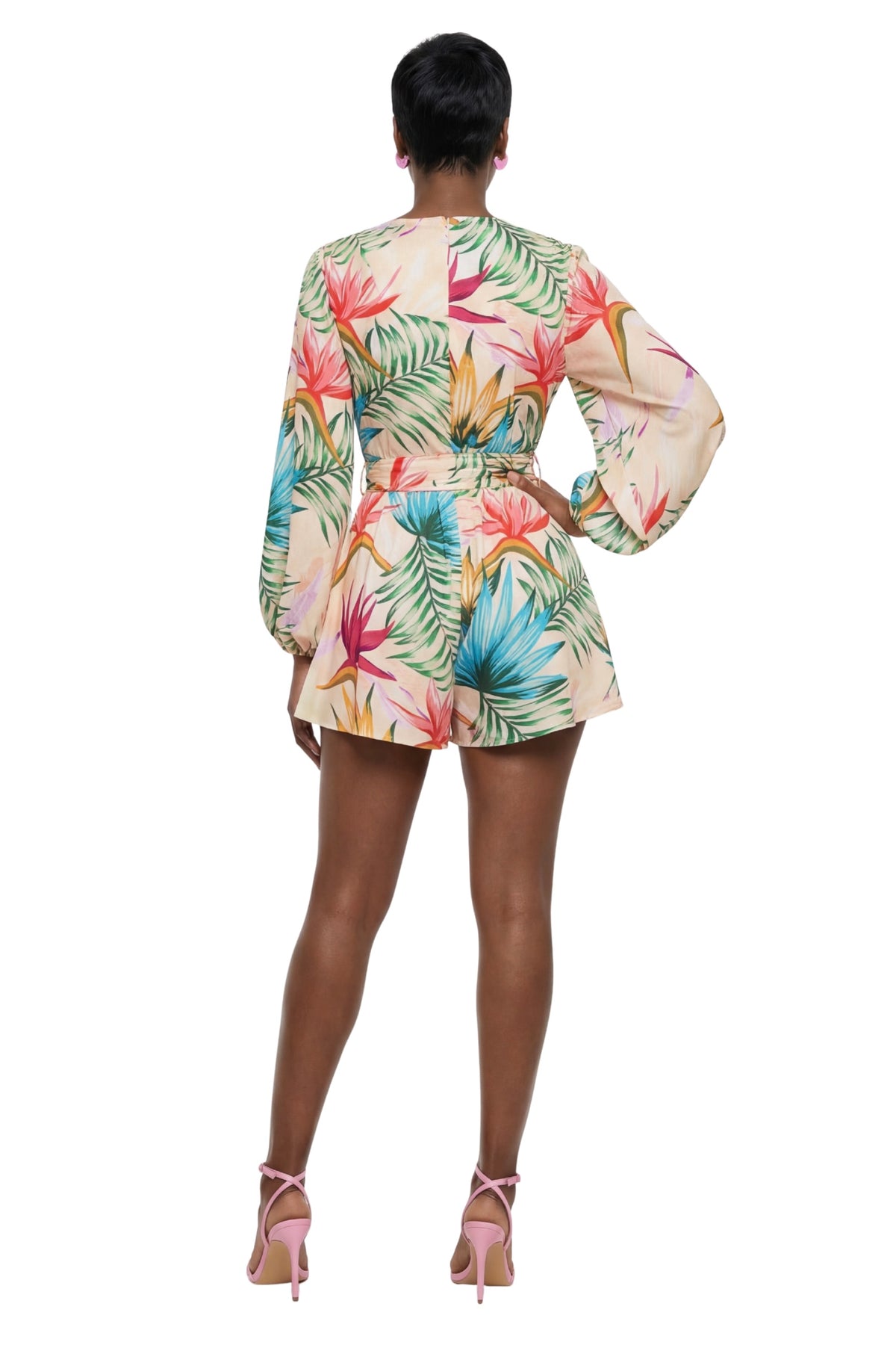 The Mai Tai Romper is a vibrant getaway in outfit form. Featuring a bold tropical print in pink, teal, gold, and green, this playful piece pairs a plunging V-neckline with billowy long sleeves for the perfect balance of flirty and chic. The self-tie belt cinches the waist, while the hidden back zipper ensures a seamless fit.
